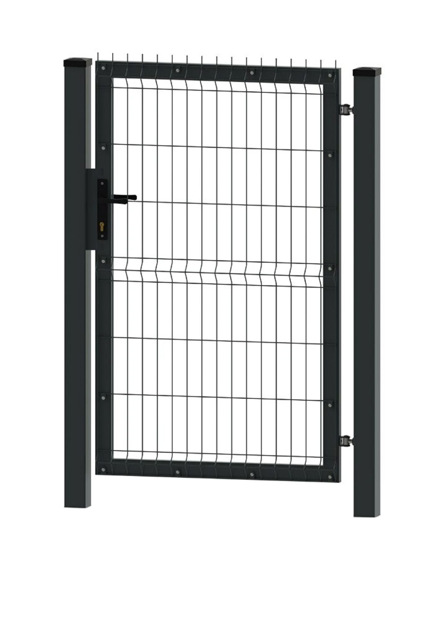 Kompletna furtka panelowa wypełniona panelem 3D, ocynkowana i malowana proszkowo: – słupy 60x60mm, daszki, – zawiasy regulowane, – klamka, – zamek, wkładka, zestaw kluczy